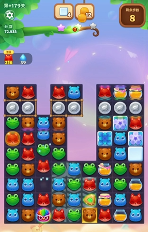 隐藏40关的布局有其特殊性,许多冰块位于难以触及的边角,并被外层的冰雪块所保护,同时毛球障碍物会周期性地出现并覆盖动物,干扰你的消除计划。开局不要急于移动,而是先花几秒钟观察整个盘面,重点留意那些被多层冰雪块封锁的角落位置,它们将是通关的主要难点。从底部区域开始着手操作通常是明智的,因为上方的动物掉落会带来新的排列组合,有机会自然形成消除或特效。规划你的每一步,思考如何为后续创造有利局面,而不仅仅是完成一次简单的三消。